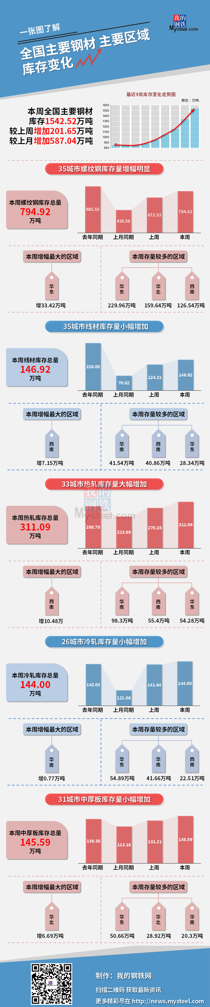 本周,全国主要钢材社会库存1542.52万吨,较上周增加201.65万吨,较上月增加587.04万吨;螺纹钢库存总量794.92万吨。