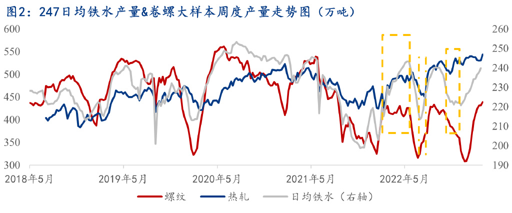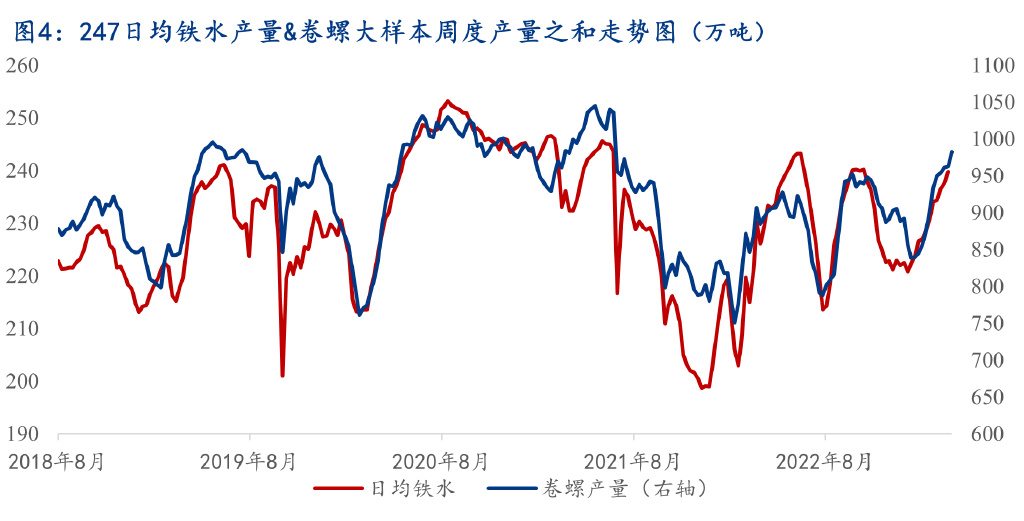 结合热卷大样本产量数据来看,3-5月份,虽然螺纹钢产量维持相对稳定,但由于热卷产量持续偏高,因此日均铁水产量一路走高。而在2022年11-12月,螺纹钢虽然出现明显减量,但由于热卷小幅增产,所以日均铁水产量并未出现减少。因此如图4所示,若是将螺纹钢与热卷大样本产量数据加总与247日均铁水产量走势图进行对比,便可以发现,二者走势并未出现明显偏差。