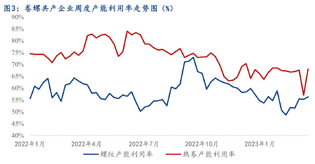 不过若是将热卷数据带入,便可以发现,2022年单是热卷大样本产量数据便已同比出现明显增长。且从Mysteel跟踪调研的卷螺共产企业的生产情况中也可以发现,如图3所示,2022年卷螺共产企业中热卷产能利用率持续居于高位,而螺纹钢产能利用率相比之下略显偏低,并且在2022年3-5月份以及11-12月份期间二者产能利用率之间的差额明显扩大,此数据也可以用来解释下一个问题:为何某些时间段螺纹钢产量走势与日均铁水产量走势出现背离。