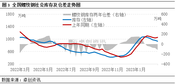 截至3月30日,卓创资讯调研的建筑钢材周度社会库存总量为1227.95万吨,较上期减少36.66万吨,库存继续消化。40城市螺纹钢社会库存926.15万吨,较上期减少29.1万吨,降幅3.05%;40城市线材库存301.80万吨,较上期减少7.56万吨,降幅2.44%;建材库存合计1227.95万吨,较上期减少36.66万吨,降幅2.90%;目前社会库存延续低于去年同期水平状态。贸易商积极出货,补货意愿不强,且需求端仍有提升下,整体社会库存处于不断消化状态。另外,库存下降是对需求表现较强的直观体现,进而带动行情上涨。