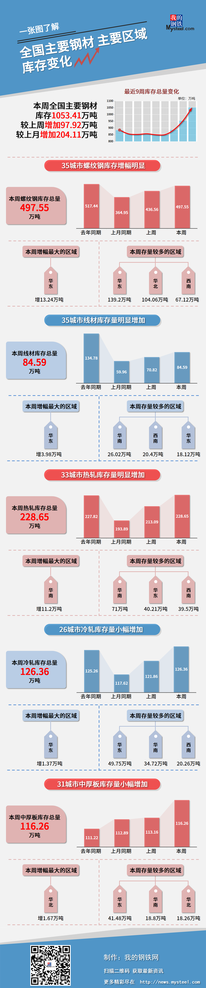 本周,全国主要钢材社会库存1053.41万吨,较上周增加97.92万吨,较上月增加204.11万吨;螺纹钢库存总量497.55万吨。