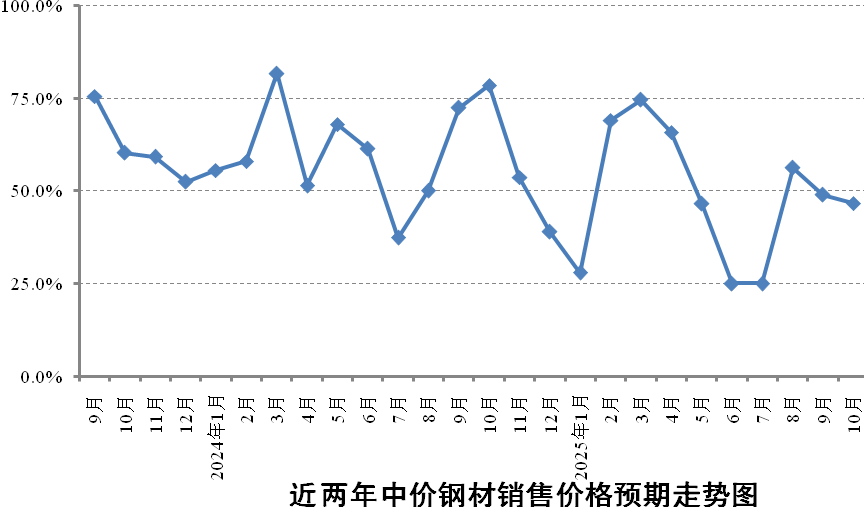 据对全国重要钢材批发市场调查,10月钢材批发市场销售价格预期指数、购进价格预期指数分别为46.67%、54.46%,比上月分别下降2.26、1.57个百分点,分处50%分界线上下,反映出市场预计钢材价格将偏弱运行。