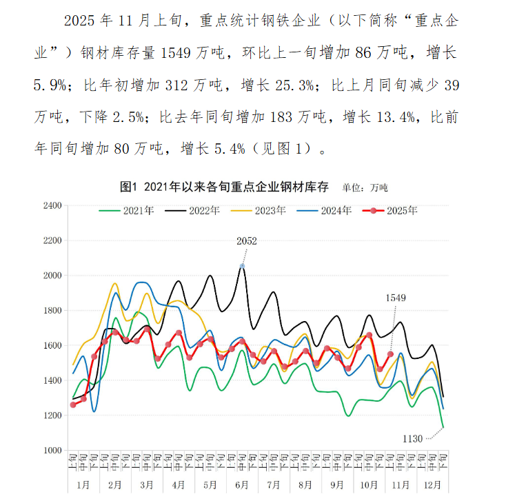 新华财经北京11月13日电 中钢协数据显示,2025年11月上旬,重点统计钢铁企业钢材库存量1549万吨,环比上一旬增加86万吨,增长5.9%;比年初增加312万吨,增长25.3%;比上月同旬减少39万吨,下降2.5%;比去年同旬增加183万吨,增长13.4%,比前年同旬增加80万吨,增长5.4%。