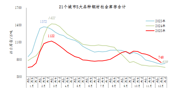 新华财经北京12月23日电 中钢协发布2025年12月中旬钢材社会库存监测旬报。12月中旬,21个城市5大品种钢材社会库存748万吨,环比减少47万吨,下降5.9%,库存降幅继续扩大;比年初增加89万吨,上升13.5%;比上年同期增加77万吨,上升11.5%。