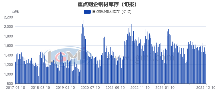 据中国钢铁工业协会统计数据显示,2025年12月上旬重点钢铁企业钢材库存量为1475万吨,旬环比增加47万吨,上升3.3%;比上月同旬减少74万吨,下降4.8%;比去年同旬增加57万吨,上升4.0%。