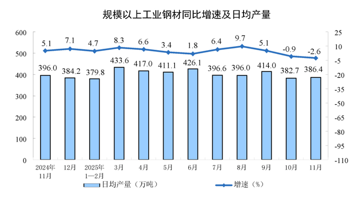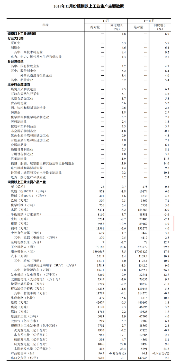 国家统计局数据显示:2025年11月份,我国粗钢产量6987万吨,同比下降10.9%;生铁产量6234万吨,同比下降8.7%;钢材产量11591万吨,同比下降2.6%。