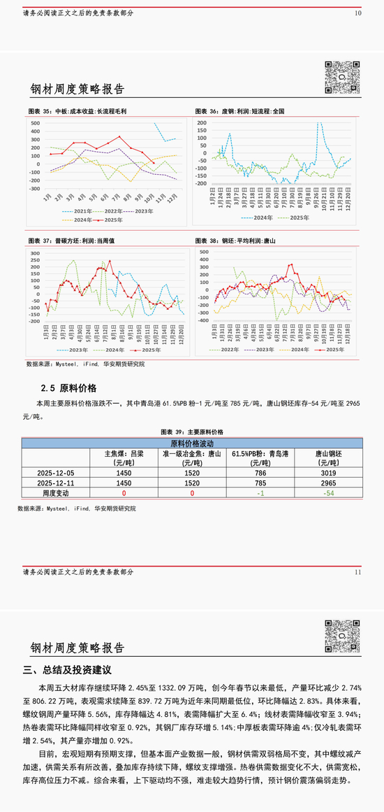 目前,宏观短期有预期支撑,但基本面产业数据一般,钢材供需双弱格局不变,其中螺纹减产加速,供需关系有所改善,叠加库存持续下降,螺纹支撑增强。热卷供需数据变化不大,供需宽松,库存高位压力不减。综合来看,上下驱动均不强,难走较大趋势行情,预计钢价震荡偏弱走势。