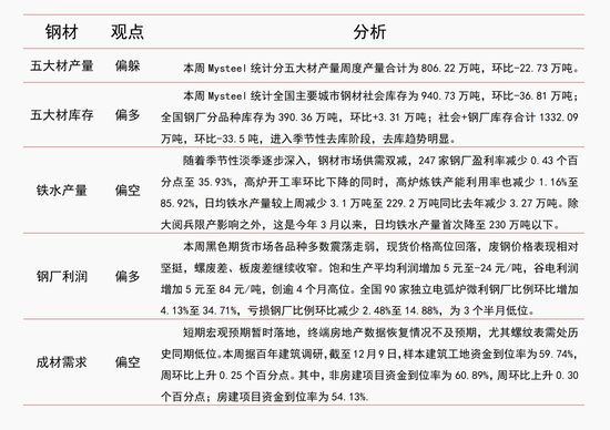 本周五大材库存继续环降 2.45%至 1332.09 万吨,创今年春节以来最低,产量环比减少 2.74%至 806.22 万吨,表观需求续降至 839.72 万吨为近年来同期最低位,环比降幅达 2.83%。具体来看,螺纹钢周产量环降 5.56%,库存降幅达 4.81%,表需降幅扩大至 6.4%;线材表需降幅收窄至 3.94%;热卷表需环比降幅同样收窄至 0.92%,其钢厂库存环增 5.14%;中厚板表需环降逾 4%;仅冷轧表需环增 2.54%,其产量亦增加 0.92%。