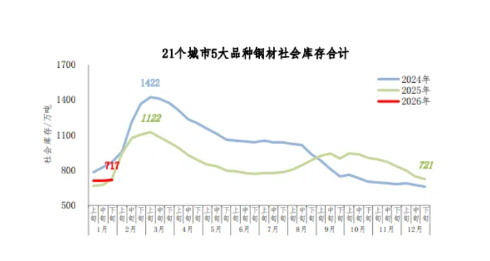 新华财经北京2月3日电 中钢协发布2026年1月下旬钢材社会库存监测旬报。2026年1月下旬,21个城市5大品种钢材社会库存717万吨,环比增加8万吨,上升1.1%,库存小幅波动;比年初减少4万吨,下降0.6%;比上年同期减少17万吨,下降2.3%。