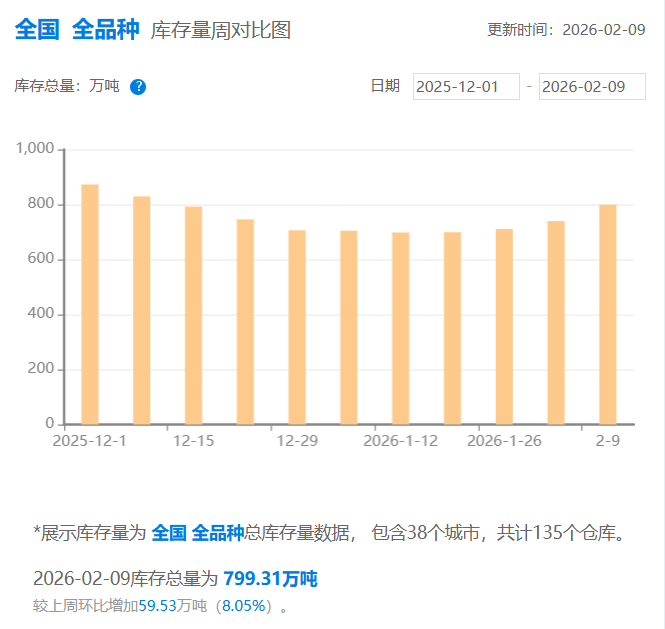 新华财经北京2月9日电 钢银电商最新数据显示,截至2月9日当周,全国38个城市,共计135个仓库的城市钢材总库存量为799.31万吨,较上周环比增加59.53万吨,增幅8.05%。