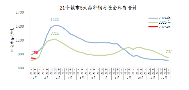 新华财经北京1月22日电 中钢协发布2026年1月中旬钢材社会库存监测旬报,1月中旬,21个城市5大品种钢材社会库存709万吨,环比减少2万吨,下降0.3%,库存小幅下降;比年初减少12万吨,下降1.7%;比上年同期增加35万吨,上升5.2%。